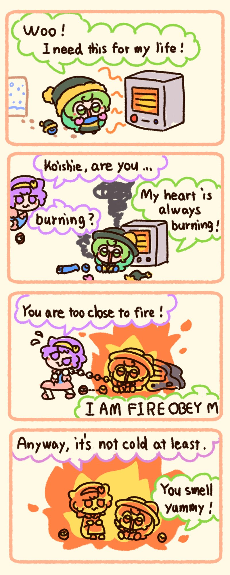 2girls 4koma :s burning comic commentary english_commentary english_text fire green_eyes green_hair heart highres komeiji_koishi komeiji_satori major_injury_underreaction multiple_girls numenoko pink_eyes pink_hair radiator siblings sisters snowing speech_bubble tan_tan_pou third_eye touhou winter_clothes