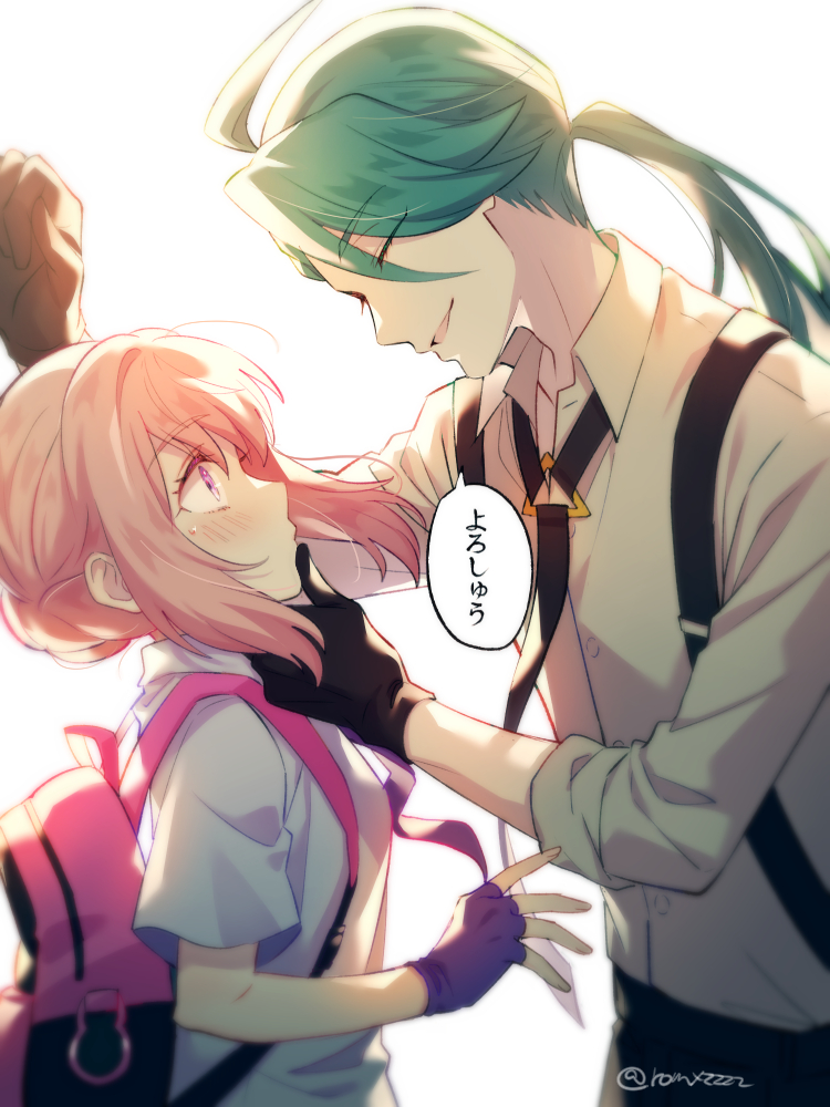 2girls age_difference alternate_hair_color alternate_hairstyle amakura_(am_as) backpack bag black_gloves black_necktie black_pants blush child closed_eyes collared_shirt commentary_request eyelashes fingerless_gloves from_side gloves green_hair hand_up juliana_(pokemon) long_hair multiple_girls necktie nintendo onee-loli pants parted_lips pink_bag pink_hair pokemon pokemon_scarlet_and_violet purple_gloves rika_(pokemon) shirt short_sleeves smile speech_bubble suspenders translation_request yuri