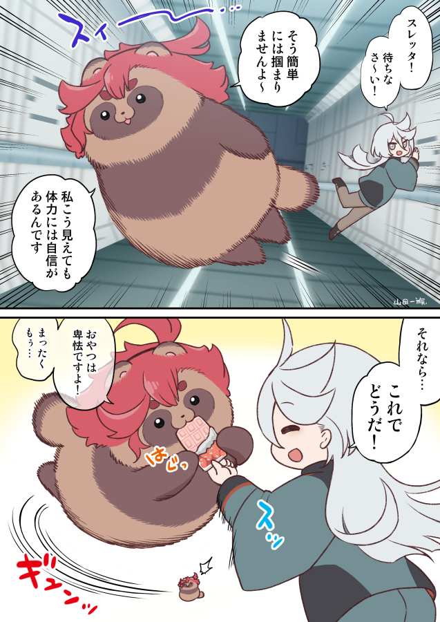 2girls 2koma ahoge animalization artist_name asticassia_school_uniform black_pantyhose comic food green_jacket green_shorts grey_eyes grey_hair gundam gundam_suisei_no_majo hair_between_eyes holding holding_food jacket long_hair long_sleeves miorine_rembran multiple_girls pantyhose pantyhose_under_shorts red_hair school_uniform shorts suletta_mercury swept_bangs tanuki translation_request wide_sleeves yamada_ichizoku