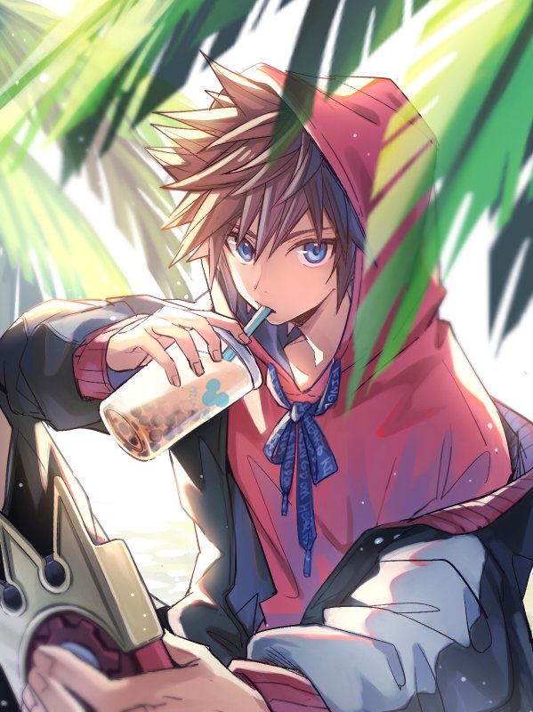 1boy blue_eyes brown_hair bubble_tea crown_(symbol) cup disposable_cup drinking drinking_straw drinking_straw_in_mouth hair_between_eyes holding holding_cup hood hood_up hoodie jacket jacket_partially_removed kingdom_hearts long_sleeves looking_at_viewer male_focus mickey palm_leaf palm_tree red_hoodie selfie short_hair solo sora_(kingdom_hearts) spiked_hair tree upper_body water yurichi_(artist)