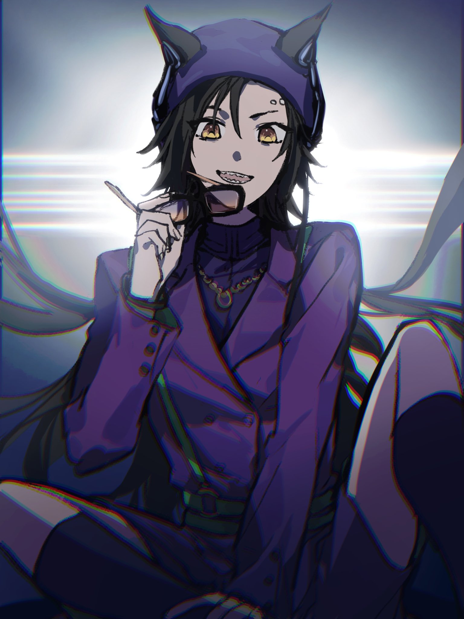 1girl air_shakur_(mag!c_number)_(umamusume) air_shakur_(umamusume) black_hair black_socks chromatic_aberration ears_through_headwear eyebrow_piercing face_piercing feet_out_of_frame hand_up hat highres holding holding_removed_eyewear jacket jewelry kneehighs long_hair long_sleeves looking_at_viewer necklace open_mouth piercing purple_hat purple_jacket purple_shirt purple_shorts rokumijio_maru sharp_teeth shirt shorts sitting smile socks solo teeth umamusume unworn_eyewear very_long_hair yellow_eyes