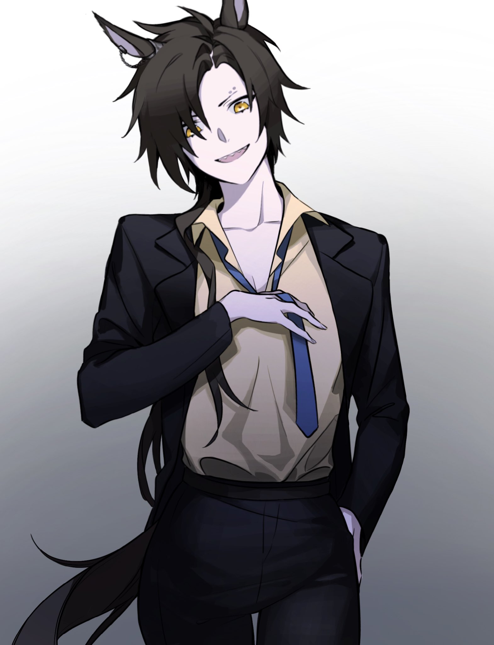 1girl air_shakur_(umamusume) alternate_costume animal_ears black_hair black_jacket black_pants blue_necktie collarbone collared_shirt cowboy_shot eyebrow_piercing face_piercing formal_clothes gradient_background highres horse_ears horse_girl horse_tail jacket long_hair long_sleeves necktie open_clothes open_jacket open_mouth pant_suit pants parted_bangs piercing rokumijio_maru sharp_teeth shirt shirt_tucked_in solo suit tail teeth umamusume upper_teeth_only yellow_eyes yellow_shirt
