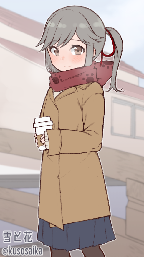 1girl alternate_costume artist_name black_pantyhose blue_skirt breath brown_coat brown_eyes brown_scarf coat dated feet_out_of_frame grey_hair hair_ribbon holding kantai_collection long_hair one-hour_drawing_challenge pantyhose paw_print pleated_skirt ponytail ribbon scarf skirt solo standing tumbler usugumo_(kancolle) yuki_to_hana