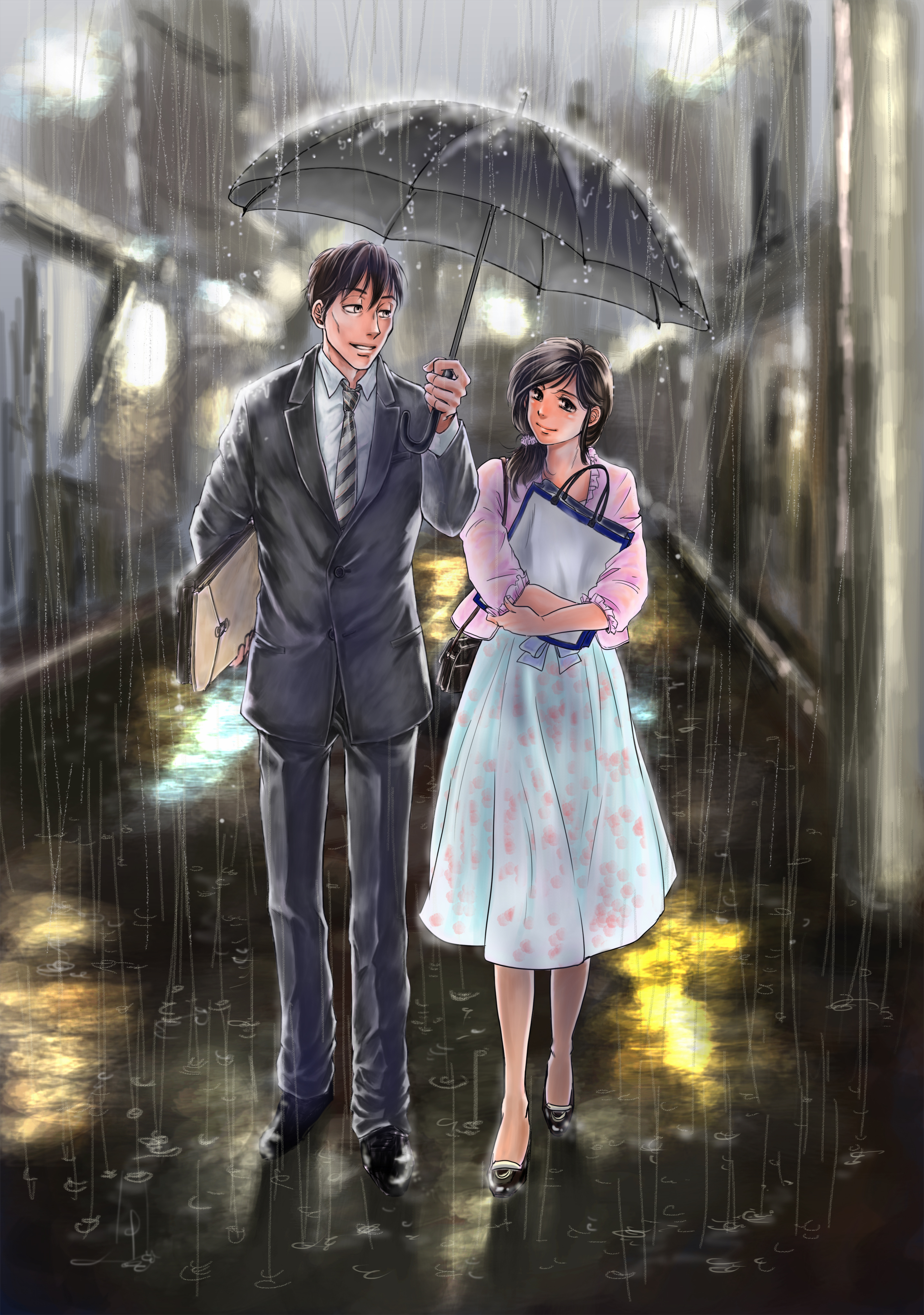 1boy 1girl absurdres back_hair bag black_footwear black_pants black_suit black_umbrella blurry blurry_background brown_eyes dress envelope formal_clothes hair_ornament hair_scrunchie handbag hetero highres holding holding_bag kawamoto_akari manila_envelope necktie outdoors pants rain sangatsu_no_lion scrunchie shared_umbrella shimada_kai_(sangatsu_no_lion) shirt short_hair show.s smile suit umbrella walking white_dress white_shirt