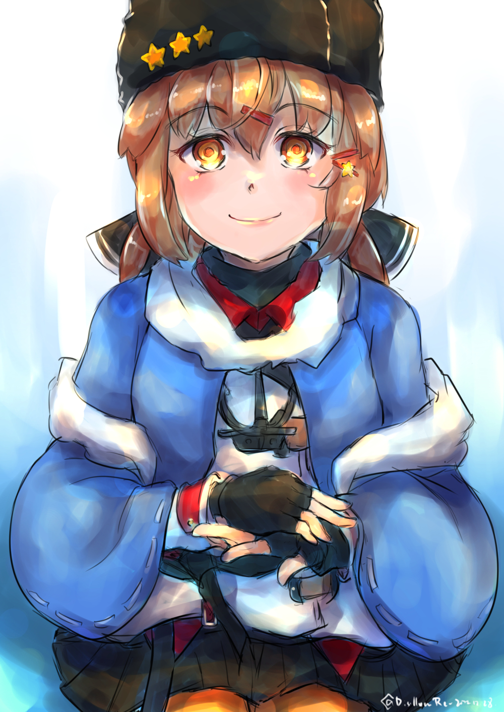 1girl anchor_necklace belt black_belt black_bow black_gloves black_hat black_skirt blue_background blue_shawl bow brown_eyes brown_hair brown_pantyhose fingerless_gloves fur_hat gloves gradient_background hair_bow hammer_and_sickle hat highres jacket jewelry kamio_(d-rev) kantai_collection long_hair low_twintails necklace one-hour_drawing_challenge pantyhose papakha red_shirt ribbon_trim russian_clothes scarf shawl shirt signature sitting skirt solo tashkent_(kancolle) torn_clothes torn_scarf twintails untucked_shirt white_jacket white_scarf