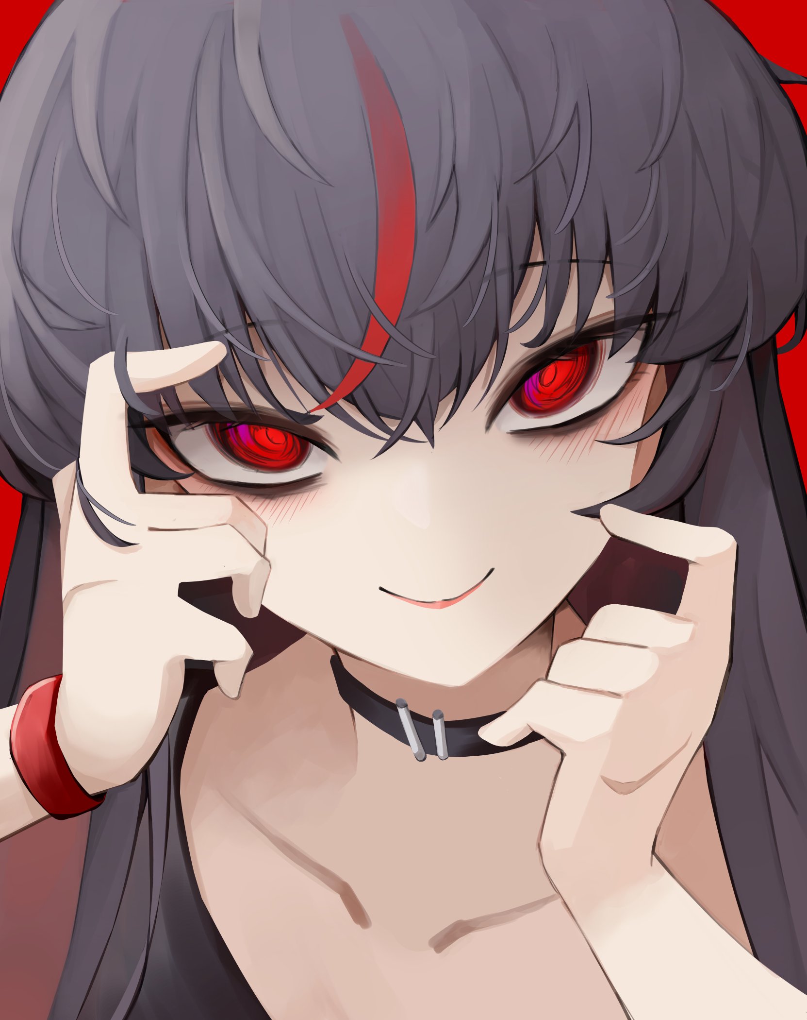 1girl black_hair blush bracelet choker closed_mouth commentary english_commentary highres jewelry long_hair looking_at_viewer multicolored_hair original red_background red_eyes simple_background smile solo streaked_hair yandere yuu_azma