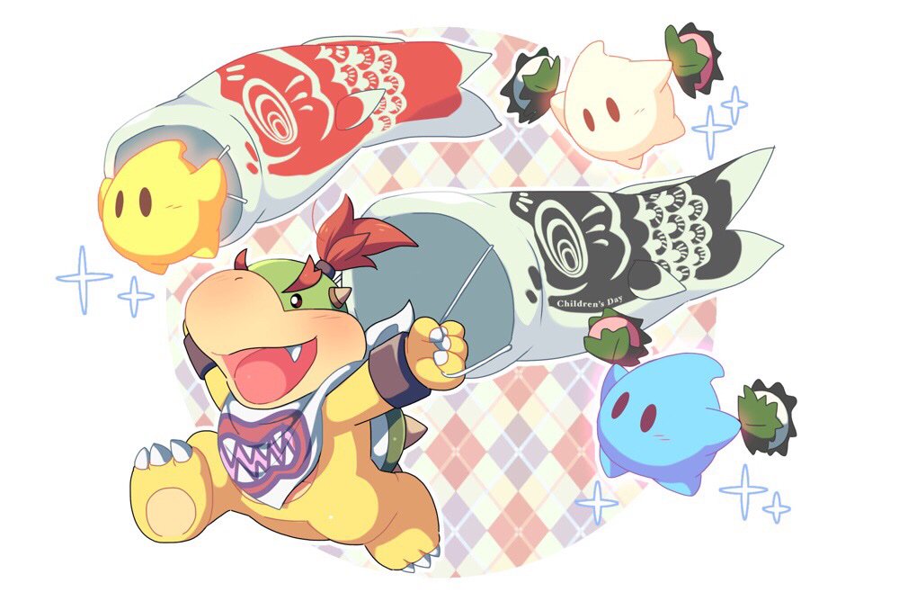1boy arms_up baby_luma bandana blue_luma blush bowser_jr. bracelet children's_day claws fang food full_body holding holding_food horns hoshikuzu_pan jewelry kodomo_no_hi koinobori luma_(mario) male_focus mario_(series) mochi nintendo no_humans open_mouth plaid_background red_hair running sakura_mochi shell simple_background smile sparkle spiked_shell spikes super_mario_galaxy turtle_shell v-shaped_eyebrows wagashi white_background white_bandana windsock