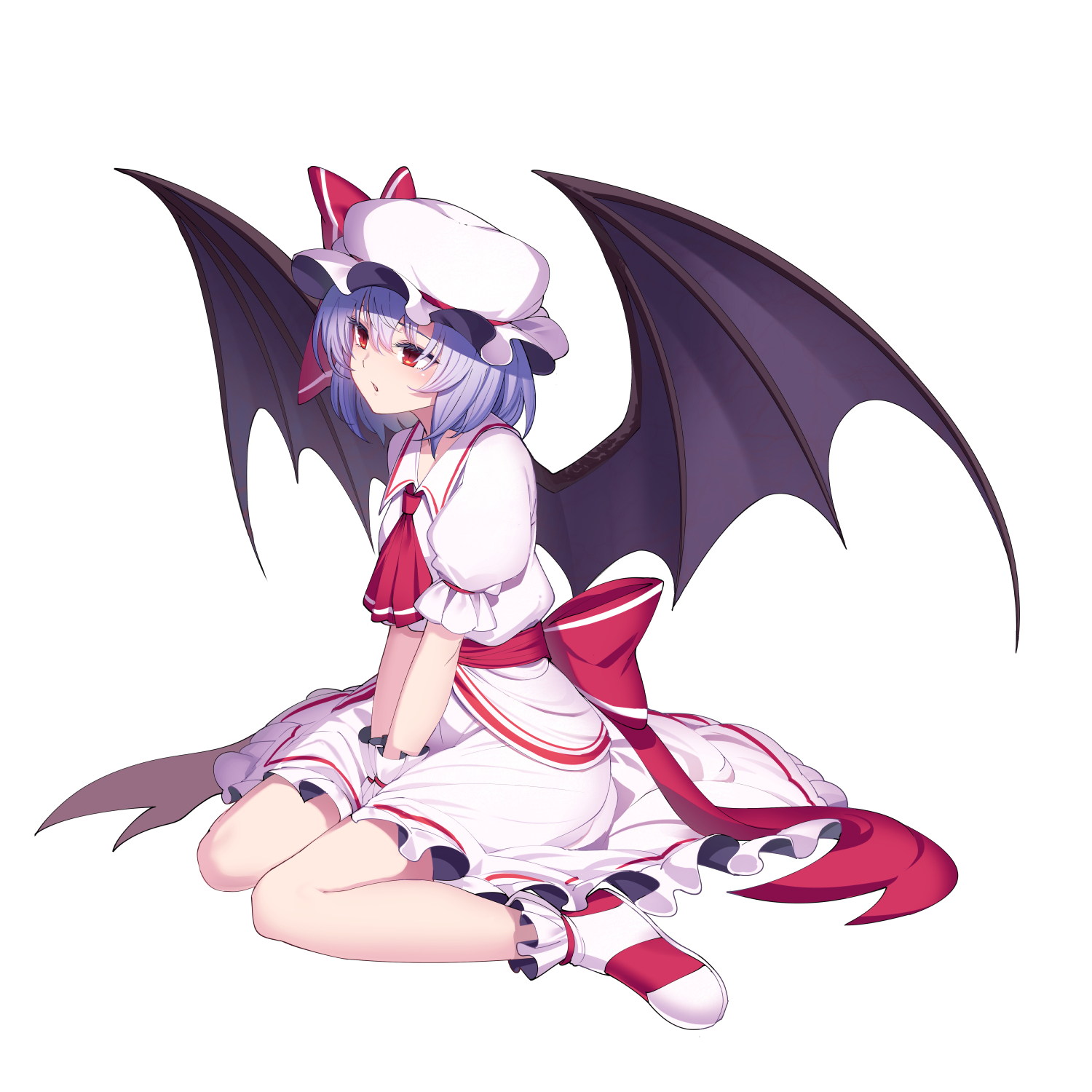 1girl ascot bat_wings bow cibo_(killy) dress hat hat_bow highres mob_cap purple_hair red_ascot red_bow red_eyes remilia_scarlet shoes short_sleeves simple_background solo touhou v_arms waist_bow white_background white_dress white_hat wings wrist_cuffs