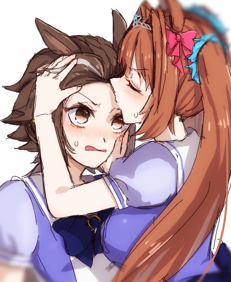 2girls animal_ears blue_bow blue_shirt blush bow breasts brown_eyes brown_hair closed_mouth commentary_request daiwa_scarlet_(umamusume) hair_bow hide_oo horse_ears kiss kissing_forehead large_breasts long_hair multicolored_hair multiple_girls nose_blush parted_lips red_bow school_uniform shirt simple_background streaked_hair sweat tiara tracen_school_uniform twintails umamusume upper_body very_long_hair vodka_(umamusume) white_background white_hair yuri