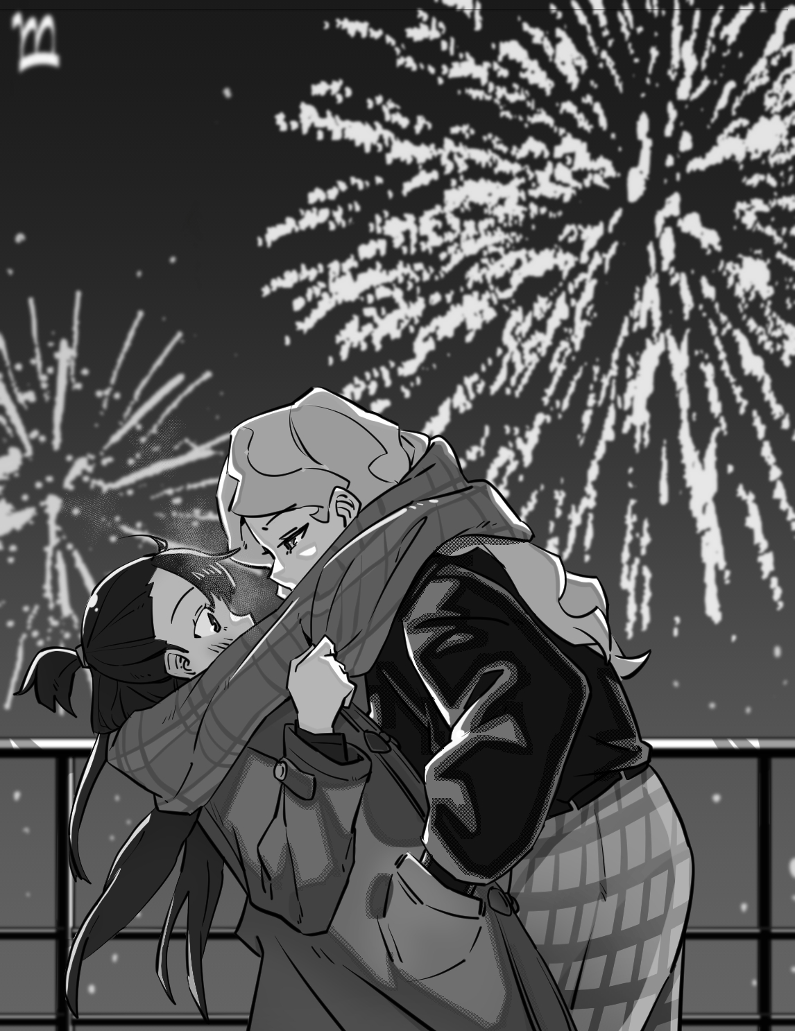 2girls blush diana_cavendish eye_contact fireworks greyscale hand_in_another's_pocket highres kagari_atsuko little_witch_academia long_hair looking_at_another mmmmpymm monochrome multiple_girls outdoors scarf shared_clothes shared_scarf yuri
