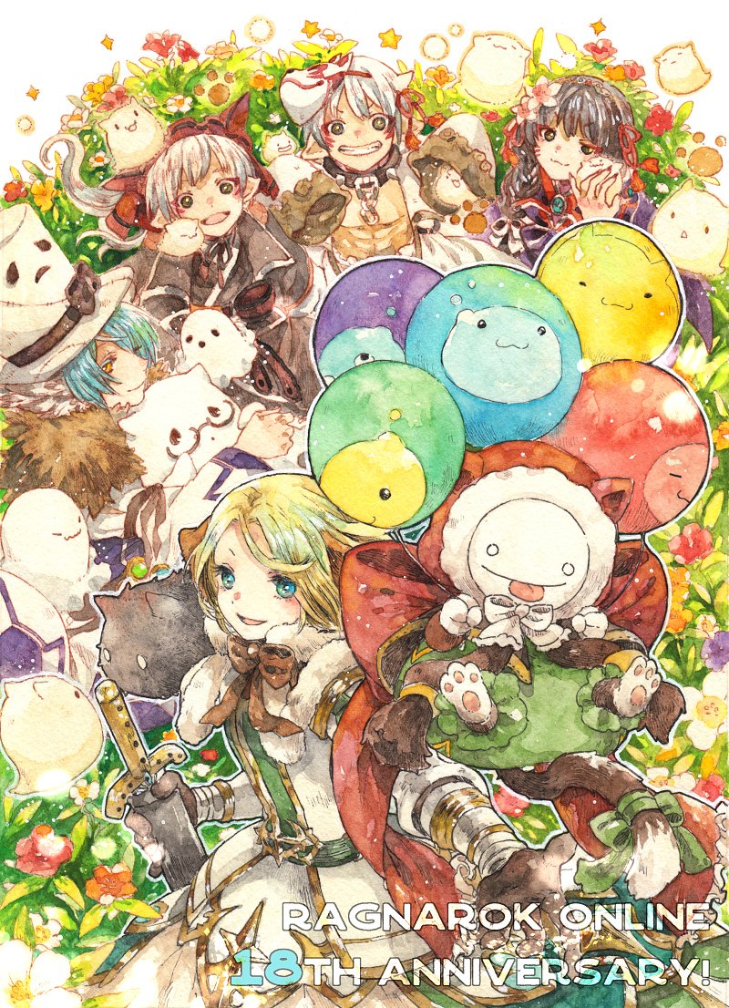 3boys 3girls :3 abs animal_hood anniversary black_cat black_eyes black_hair black_shirt blonde_hair blue_hair blush brown_hair cat cat_hood closed_mouth commentary_request detached_sleeves dress drops_(ragnarok_online) ghost green_dress green_eyes holding holding_sword holding_weapon hood long_hair looking_at_viewer marin_(ragnarok_online) mask masked multiple_boys multiple_girls official_alternate_costume open_mouth orange_eyes pointy_ears poring ragnarok_online shirt short_hair smile sorcerer_(ragnarok_online) soul_reaper_(ragnarok_online) star_emperor_(ragnarok_online) summoner_(ragnarok_online) sword swordsman_(ragnarok_online) tokio_(okt0w0) upper_body weapon whisper_(ragnarok_online) white_cat white_hair white_sleeves