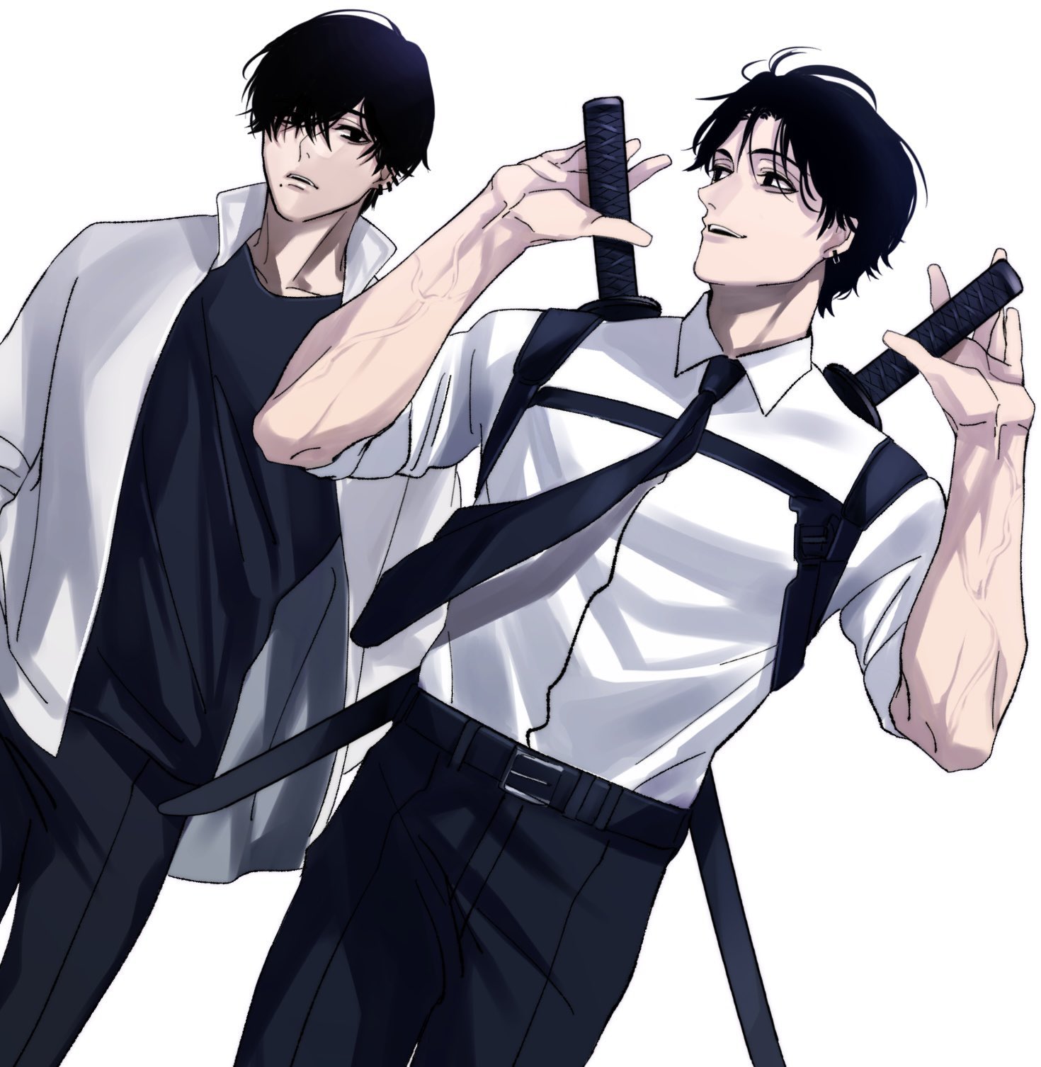 2boys black_hair black_necktie black_pants black_shirt chainsaw_man chest_belt collared_shirt dual_wielding ear_piercing hair_over_one_eye highres holding jacket kishibe_(chainsaw_man) kishibe_(young)_(chainsaw_man) looking_at_another mole mole_under_mouth multiple_boys multiple_piercings necktie open_mouth pants piercing shirt shirt_tucked_in short_hair simple_background siraco_(sira5_3) sleeves_rolled_up smile veins veiny_arms white_background white_jacket white_shirt yoshida_hirofumi
