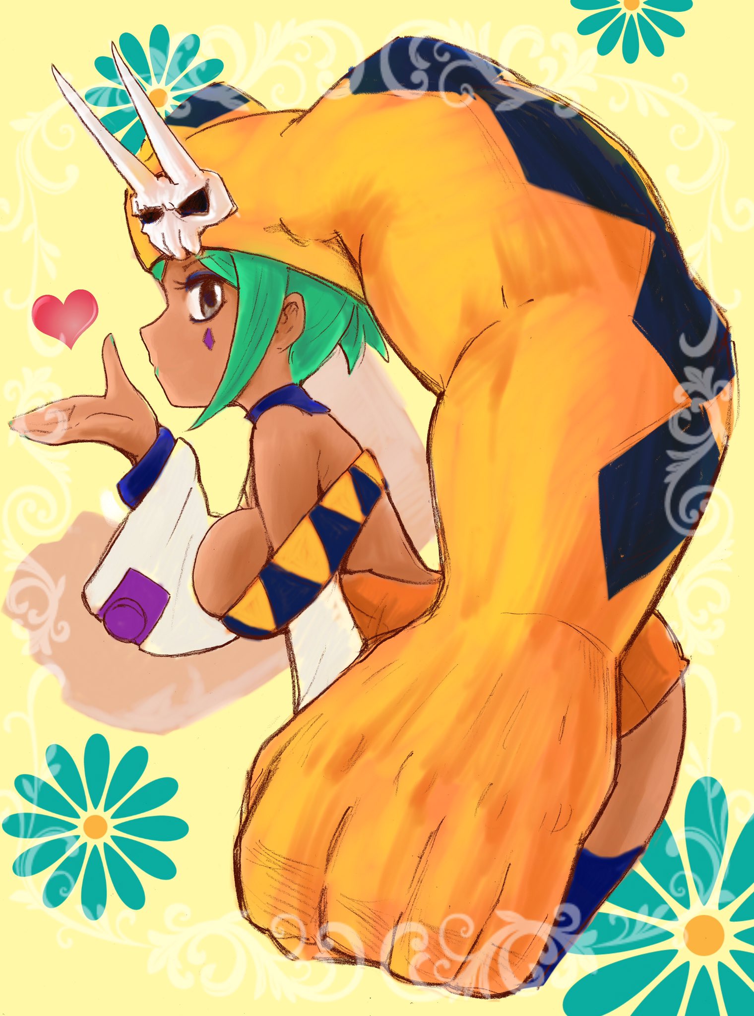 1girl ass bellaraika blowing_kiss breasts cerebella_(skullgirls) detached_collar dress flower flower_print from_side green_hair grey_hair hand_up hanging_breasts heart highres large_breasts leaning_forward looking_at_viewer short_dress skullgirls solo vice-versa_(skullgirls) yellow_background