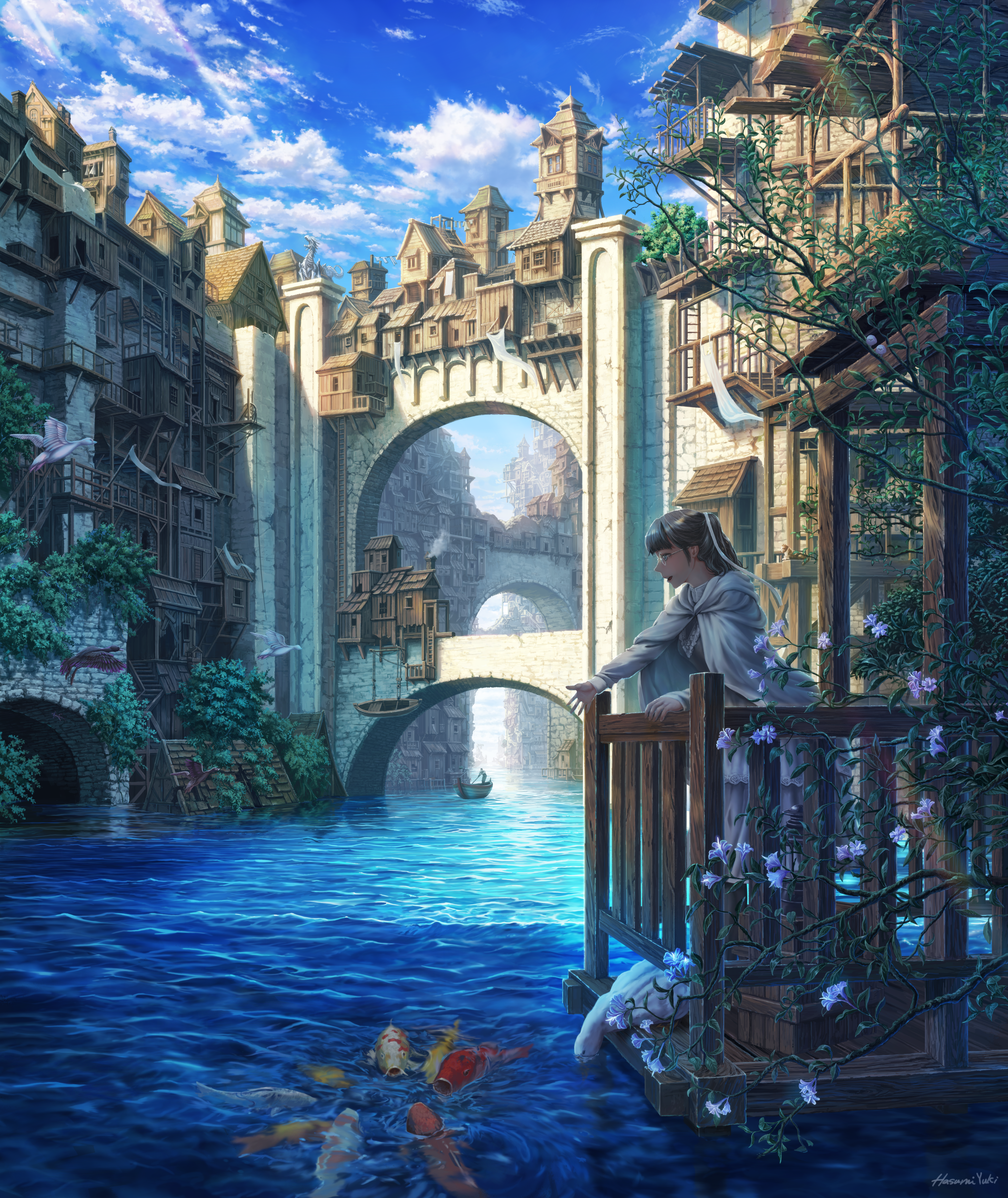 1boy 1girl absurdres bird black_hair blurry boat bridge building cat city cityscape cloak cloud cloudy_sky commentary depth_of_field duck fantasy feeding fish glasses green_eyes hair_ribbon hasumi_yuuki highres koi ladder laundry light_rays medium_hair oar open_hand open_mouth original outdoors profile railing ribbon rowboat scenery shack shade sky smile smoke smokestack stairs statue sunlight tree vanishing_point water watercraft wind