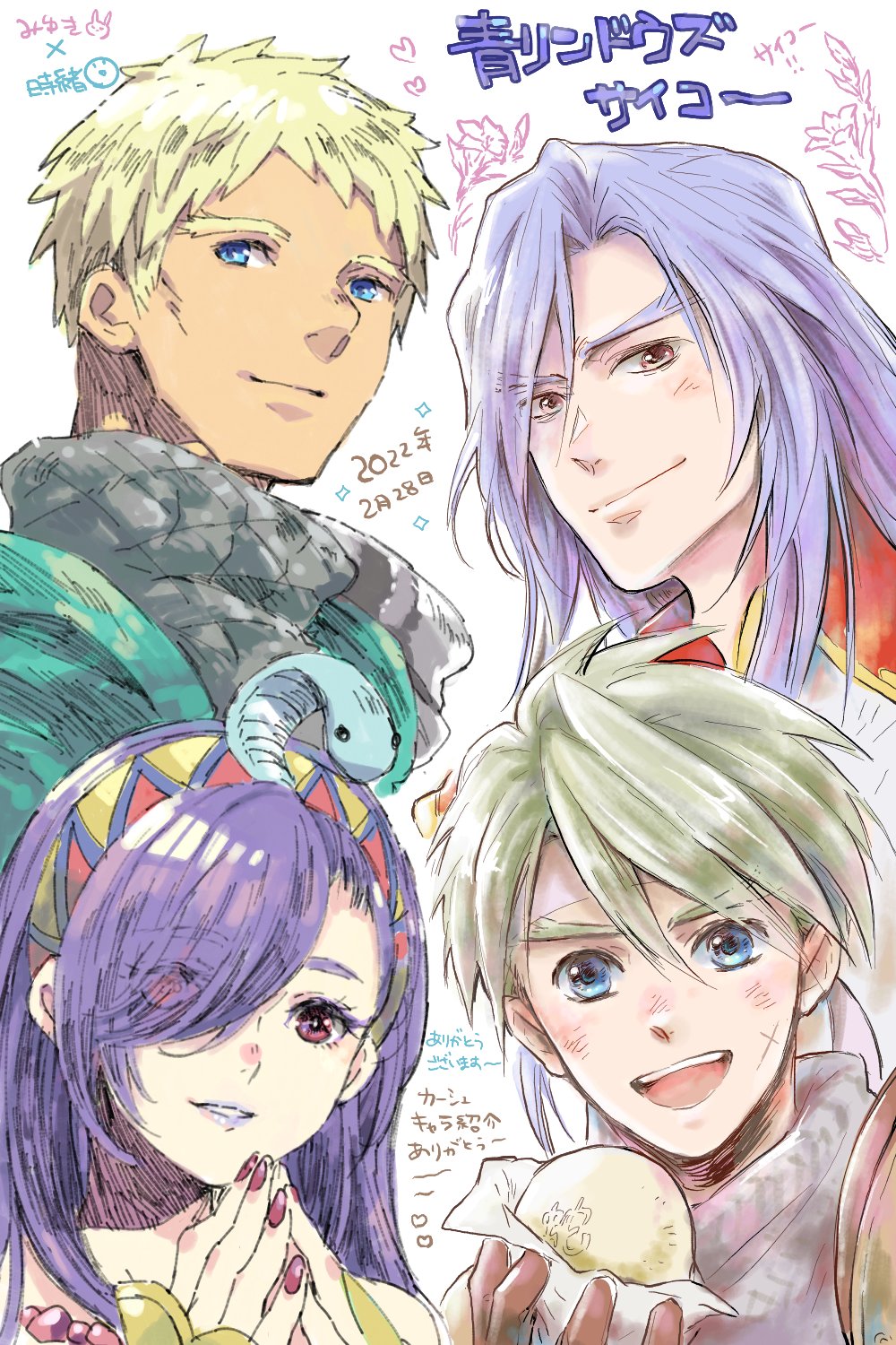 1girl 3boys artist_collaboration steamed_bun blonde_hair blue_eyes blush chrono_cross closed_mouth commentary_request dario_(chrono_cross) dated eyes_visible_through_hair food glenn_(chrono_cross) green_hair hair_between_eyes highres karsh_(chrono_cross) long_hair looking_at_viewer mi_(matilda-mc) multiple_boys open_mouth purple_hair red_eyes riddel_(chrono_cross) scarf short_hair smile snake steepled_fingers tokio_(okt0w0) translation_request upper_body very_short_hair