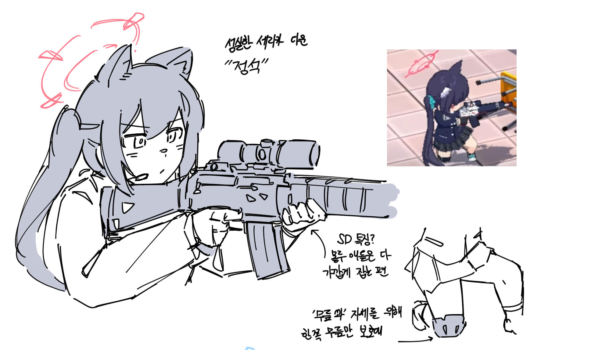 1girl assault_rifle beretta_ar70/90 blue_archive flukhan full_body gun highres korean_text rifle school_uniform scope serika_(blue_archive) solo translation_request twitter twitter_username weapon white_background