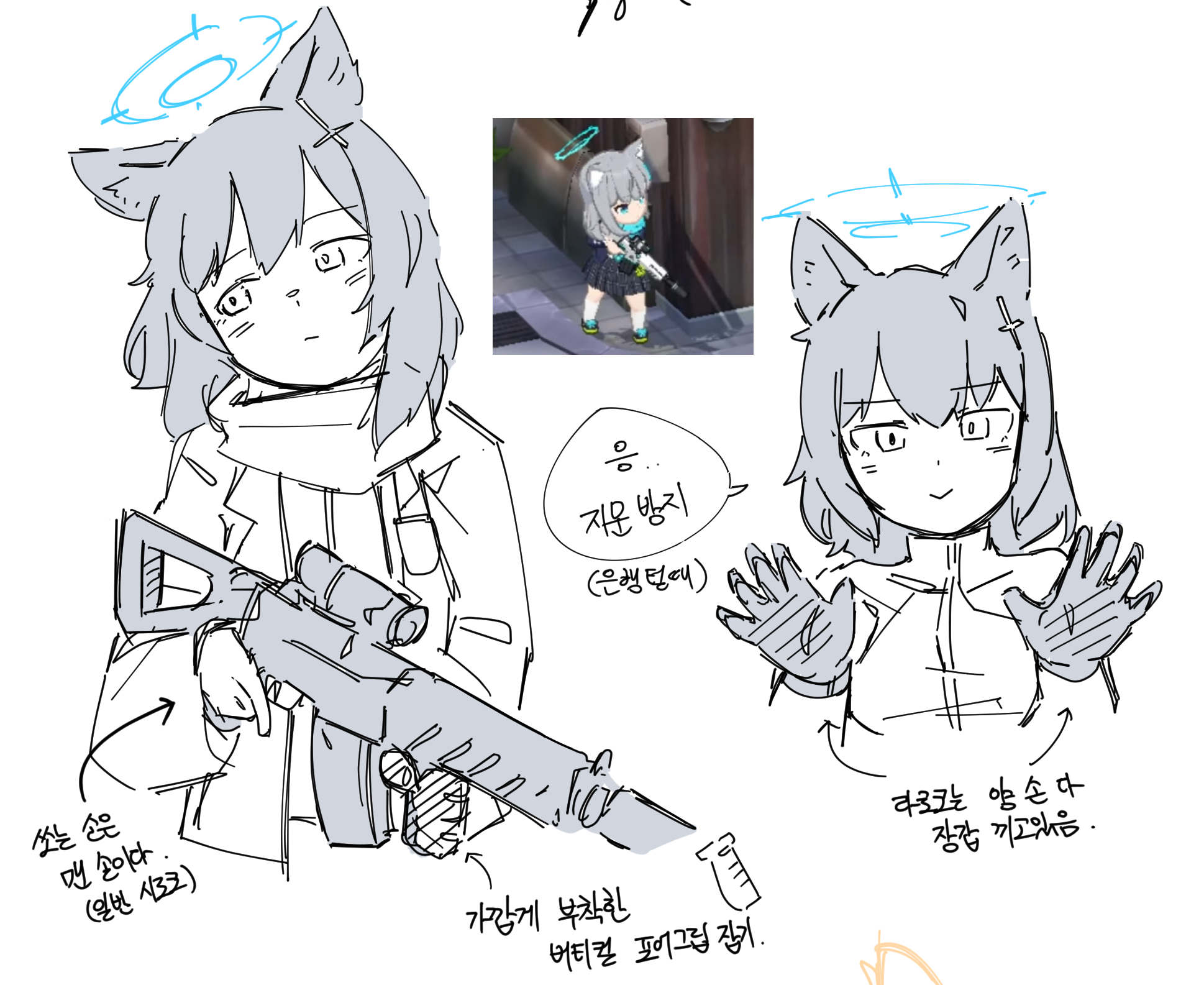 1girl assault_rifle blue_archive flukhan full_body gloves gun highres korean_text school_uniform shiroko_(blue_archive) sig_sauer_556 solo twitter twitter_username weapon white_background
