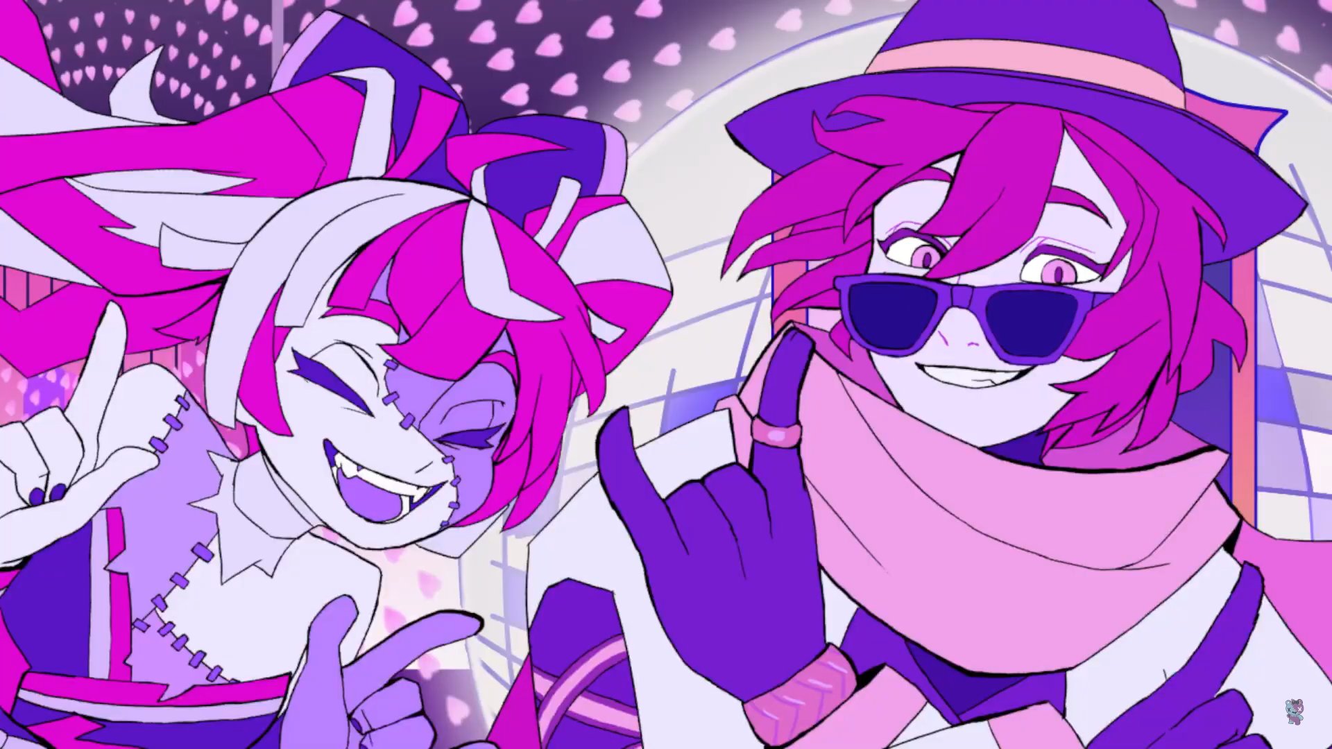 1boy 1girl :d ayoiji blunt_ends bow closed_eyes disco_ball dress facing_viewer fangs fedora gloves grin hair_bow hanasaki_miyabi hat highres hololive hololive_indonesia holostars index_finger_raised jacket jewelry kureiji_ollie limited_palette long_hair looking_at_viewer \n/ nail_polish official_alternate_costume ooedo_julia_night_(vocaloid) open_mouth patchwork_skin pink_eyes pink_hair pink_scarf purple_gloves ring scarf short_hair smile stitched_arm stitched_face stitched_torso stitches strapless strapless_dress sunglasses teeth torn_clothes torn_dress twintails upper_body virtual_youtuber vocaloid white_hair white_jacket zombie