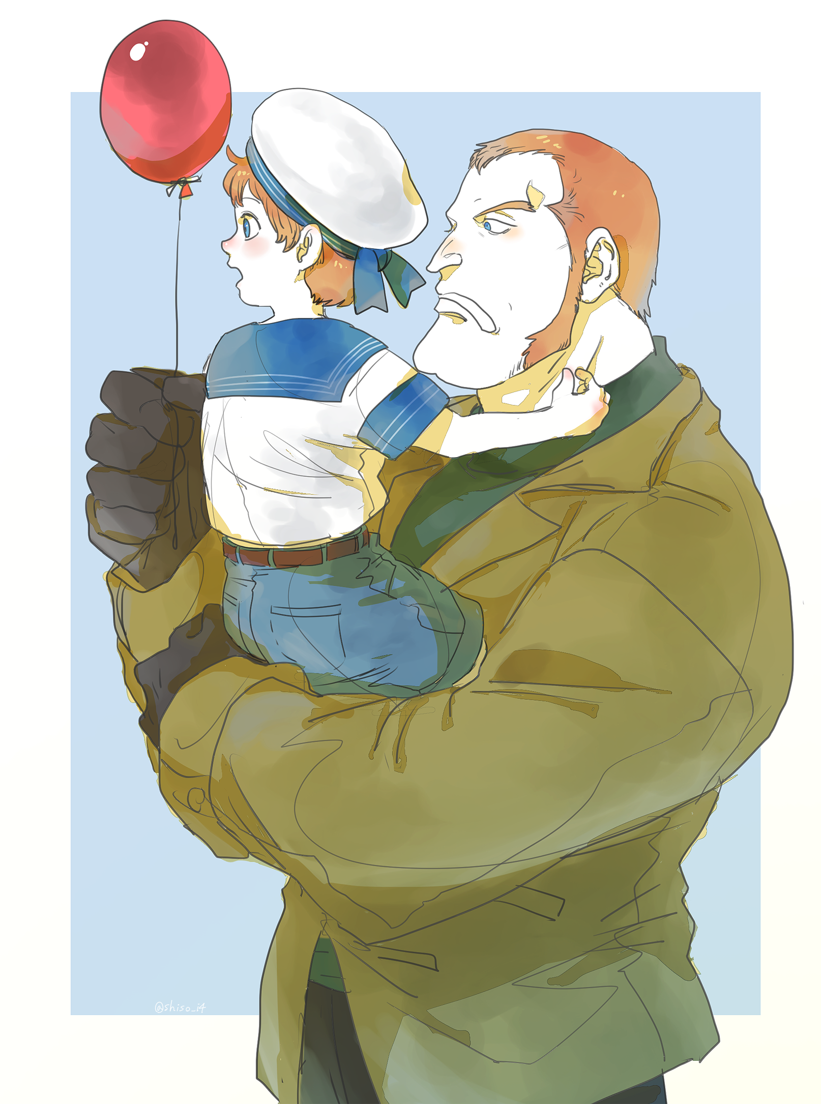 2boys aged_down balloon black_gloves blue_eyes brown_jacket carrying carrying_person diez_barrels father_and_child father_and_son gloves hat highres holding holding_balloon jacket looking_ahead looking_back multiple_boys one_piece open_mouth parent_and_child red_hair sailor_collar sailor_hat sailor_shirt shirt shiso_i4 short_hair short_sleeves shorts sideburns upper_body x_drake