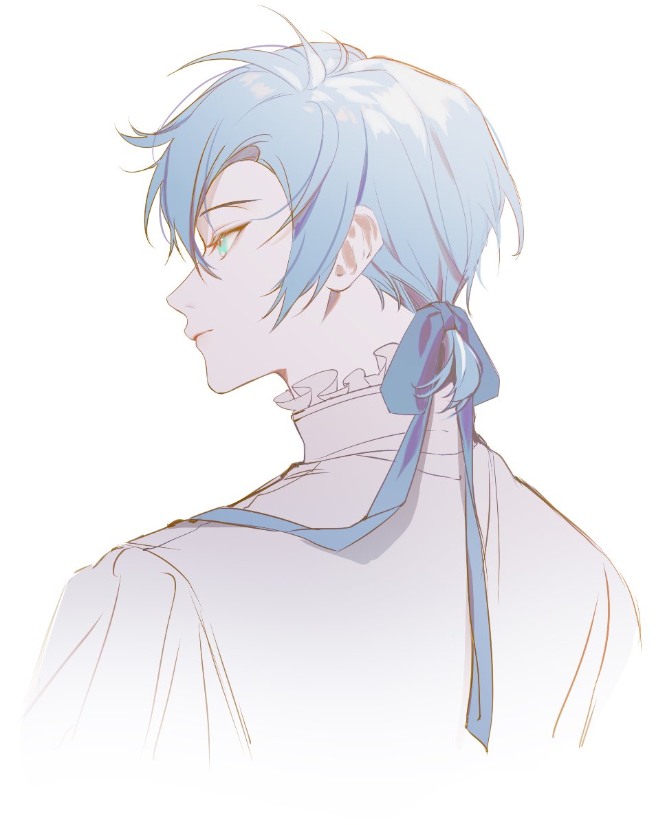 1boy alternate_costume alternate_hairstyle bad_id bad_twitter_id blue_hair blue_ribbon closed_mouth commentary cropped_torso frilled_shirt_collar frills from_behind green_eyes hair_between_eyes hair_ribbon highres holostars holostars_english low_ponytail male_focus multicolored_hair ponytail profile regis_altare ribbon shirt short_hair short_ponytail simple_background solo streaked_hair to_e virtual_youtuber white_background white_shirt