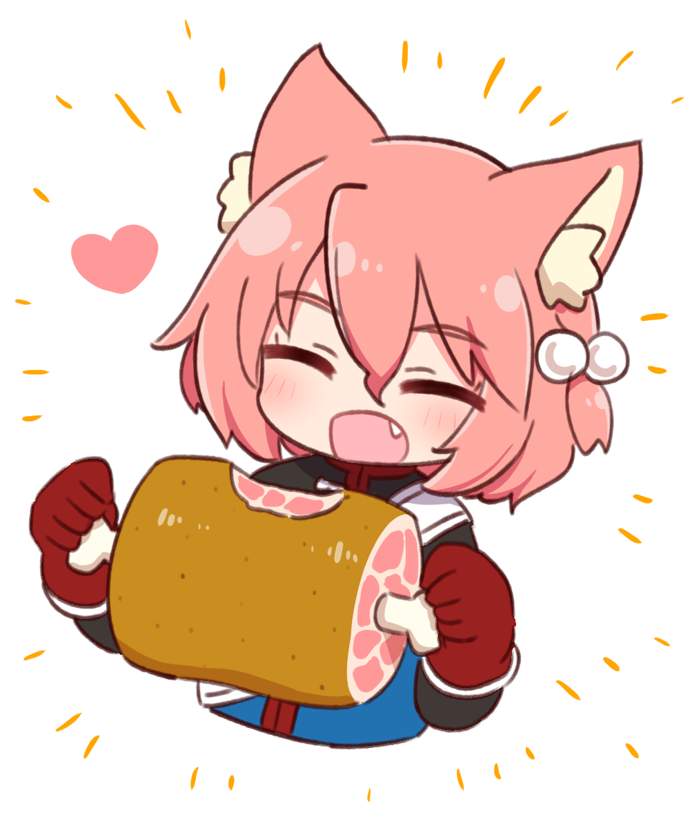 1girl 7th_dragon 7th_dragon_(series) :d ^_^ animal_ear_fluff animal_ears blue_jacket blush boned_meat cat_ears closed_eyes cropped_torso fang fighter_(7th_dragon) food gloves hair_between_eyes hair_bobbles hair_ornament hands_up harukara_(7th_dragon) heart highres holding holding_food jacket long_sleeves meat naga_u one_side_up open_mouth red_gloves simple_background smile solo upper_body white_background