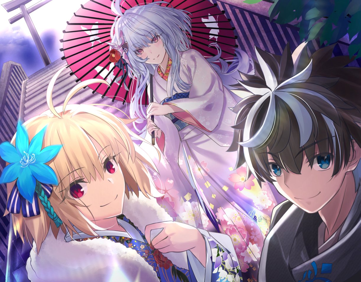 1boy 2girls alternate_costume antenna_hair arcueid_brunestud arcueid_brunestud_(mooncancer) black_hair black_kimono blonde_hair blue_eyes blue_flower blue_kimono charlemagne_(fate) closed_mouth commentary_request fate/grand_order fate_(series) floral_print flower hair_between_eyes hair_flower hair_ornament holding holding_umbrella japanese_clothes kimono long_hair looking_at_viewer merlin_(fate/prototype) multicolored_hair multiple_girls neko_daruma oil-paper_umbrella pink_eyes pink_kimono shirt smile stairs tsukihime tsukihime_(remake) two-tone_hair umbrella very_long_hair white_shirt
