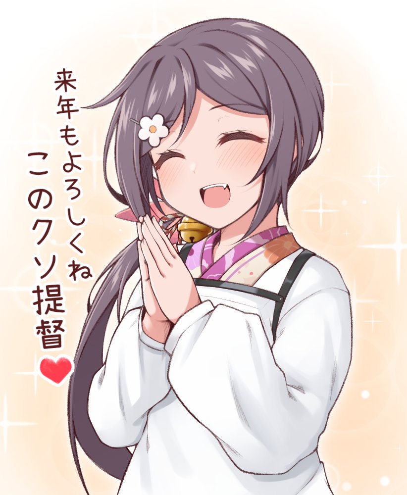 1girl akebono_(kancolle) akebono_(new_year)_(kancolle) alternate_costume apron bell closed_eyes fang flower gradient_background grey_hair hair_bell hair_flower hair_ornament happy_new_year japanese_clothes jingle_bell kantai_collection kappougi kimono long_hair new_year shitty_admiral_(phrase) side_ponytail smile solo sparkle_background very_long_hair yuki_to_hana