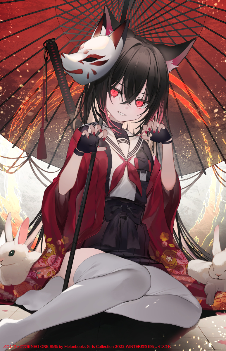 amakawa_sakko animal_ear_fluff animal_ears black_gloves black_hair breast_pocket crossed_bangs fingerless_gloves fingernails fox_mask full_body gloves grin hair_between_eyes hands_up highres looking_at_viewer mask mask_on_head multicolored_hair neckerchief oil-paper_umbrella original paw_pose pleated_skirt pocket rabbit red_eyes red_hair red_nails red_neckerchief sailor_collar school_uniform serafuku sitting skirt smile sword thighhighs two-tone_hair umbrella weapon white_thighhighs wide_sleeves