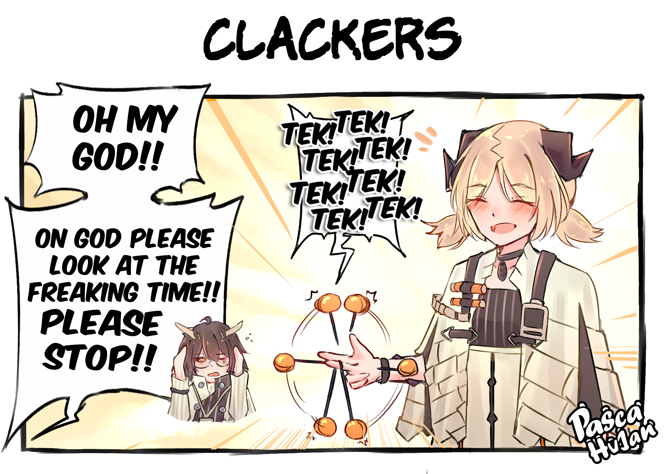 2girls arknights artist_name blonde_hair brown_hair capelet choker clacker closed_eyes covering_own_ears demon_horns english_text feather_hair glasses hands_up highres horns ifrit_(arknights) multiple_girls owl_ears owl_girl parted_bangs pascahujan short_hair silence_(arknights)