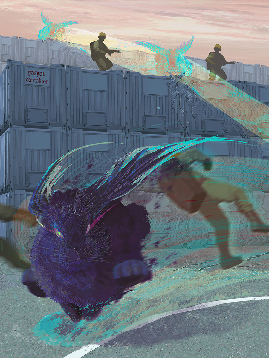 4others animal animal_ears animal_focus backpack bag commentary_request creature gun helmet highres holding holding_gun holding_weapon military military_uniform motion_blur multiple_others original oversized_animal pink_sky rabbit rabbit_ears rifle shipping_container sky toy(e) weapon yuugai_choujuu