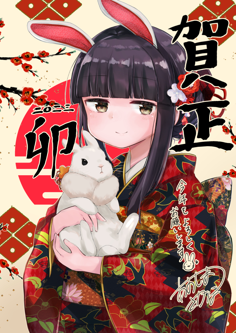 1girl 2023 animal animal_ears aoshima_sakana artist_name black_hair blunt_bangs brown_eyes chinese_zodiac closed_mouth egasumi floral_print flower happy_new_year hatsuyuki_(kancolle) japanese_clothes japanese_text kantai_collection kimono long_hair new_year obi print_kimono rabbit rabbit_ears red_flower red_kimono sash signature smile solo upper_body year_of_the_rabbit