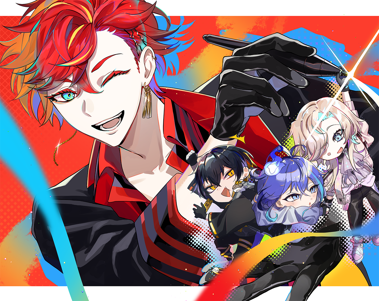 4boys :d :o ;d ^^^ antenna_hair aqua_eyes aqua_hair arm_up ascot azumame_tetora black_coat black_footwear black_gloves black_hair black_jacket black_pants black_shirt blonde_hair blue_eyes boots bracelet chibi clenched_hand coat colored_inner_hair cropped_jacket crossed_bangs dangling earrings full_body gloves grey_ascot grey_hoodie hair_between_eyes hair_ornament hair_over_one_eye hairclip high_heel_boots high_heels hitodama hizaki_gamma holding holding_hands holding_pen holostars hood hoodie in_palm jacket jewelry letterboxed long_hair looking_at_another looking_at_viewer looking_back minase_rio minase_rio_(1st_costume) mismatched_earrings multicolored_background multicolored_hair multiple_boys one_eye_closed open_collar open_mouth orange_background orange_hair outside_border pants pen pink_hair pink_shoes purple_hair red_hair red_shirt shirt shoes short_hair smile streaked_hair striped_clothes striped_shirt teeth thigh_strap two-tone_hair two-tone_shirt upper_body uproar_(holostars) utsugi_uyu virtual_youtuber white_footwear white_jacket white_shirt yatogami_fuma yellow_eyes