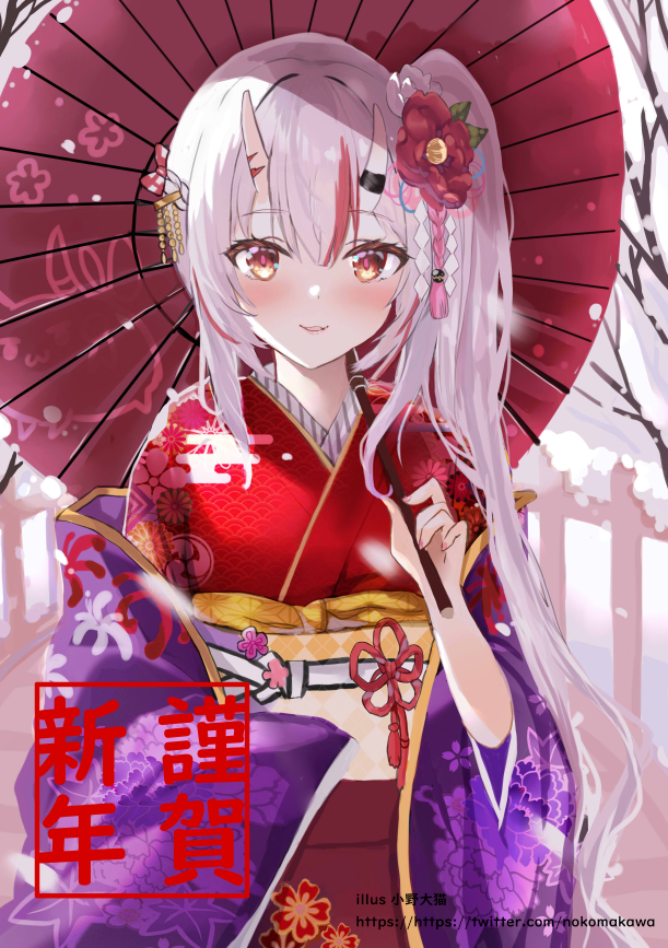 1girl 2023 commentary_request egasumi floral_print flower hair_between_eyes hair_flower hair_ornament holding holding_umbrella hololive horns japanese_clothes kimono long_hair long_sleeves looking_at_viewer lunacats multicolored_hair nakiri_ayame nakiri_ayame_(new_year) obi oil-paper_umbrella oni parted_lips print_kimono red_eyes red_flower red_hair red_kimono sash side_ponytail skin-covered_horns smile solo streaked_hair umbrella very_long_hair virtual_youtuber watermark web_address white_flower white_hair wide_sleeves