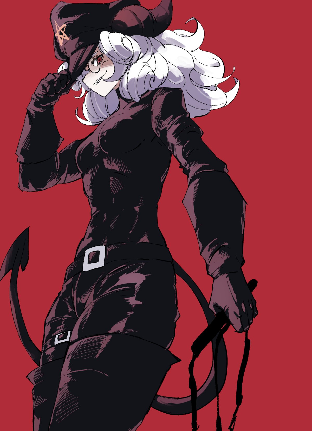 1girl belt black_belt black_bodysuit black_gloves black_horns black_tail bodysuit breasts demon_girl demon_horns demon_tail gloves hand_up helltaker highres holding holding_whip horns long_hair looking_at_viewer medium_breasts oioidaddy pandemonica_(helltaker) parted_lips pentagram profile red_eyes smile solo tail white_hair
