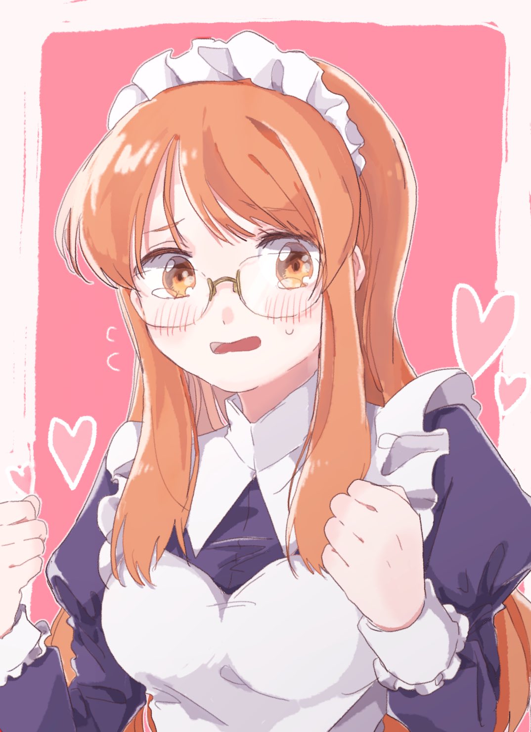 1girl apron asahina_mikuru bespectacled blush breasts commentary_request enso_doraiba glasses heart highres long_hair long_sleeves maid maid_headdress medium_breasts official_alternate_costume open_mouth orange_eyes orange_hair shy solo suzumiya_haruhi_no_yuuutsu sweatdrop white_apron