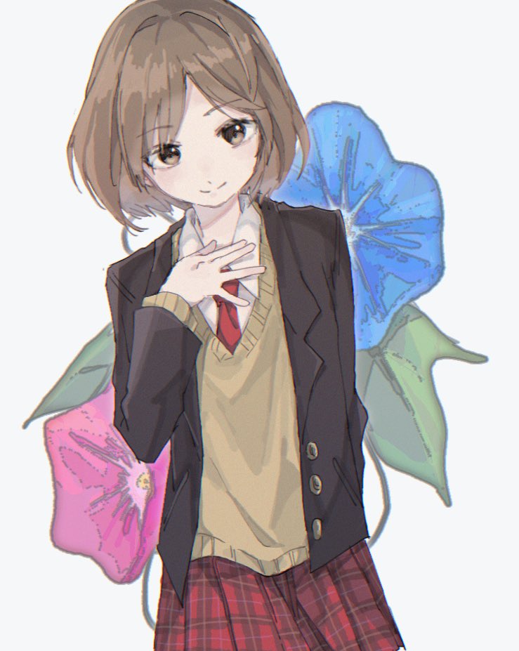 1girl blazer brown_eyes brown_hair brown_jacket cardigan closed_mouth collared_shirt commentary_request enso_doraiba jacket long_sleeves necktie open_clothes open_jacket plaid_clothes plaid_skirt red_necktie red_skirt sasaki_(suzumiya_haruhi) school_uniform shirt short_hair simple_background skirt smile solo suzumiya_haruhi_no_yuuutsu white_background white_shirt winter_uniform yellow_cardigan
