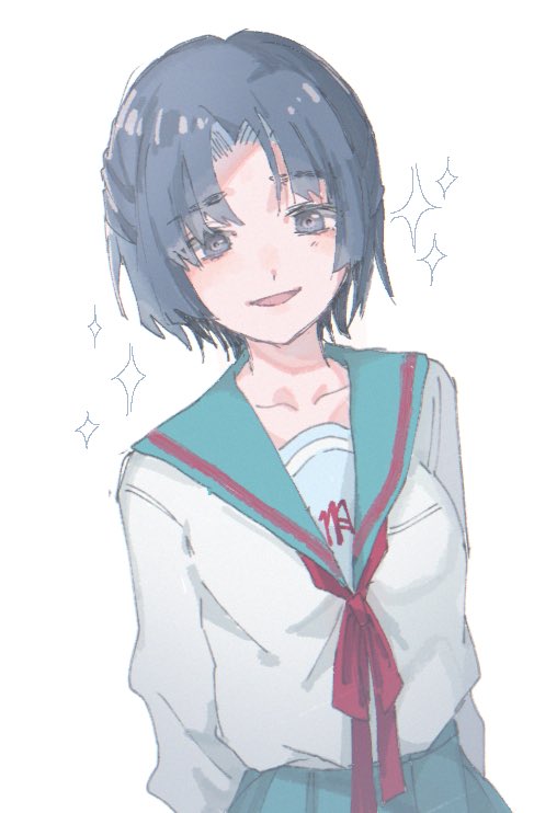1girl alternate_hair_length alternate_hairstyle asakura_ryoko blue_eyes blue_hair blue_sailor_collar blue_skirt collarbone enso_doraiba kita_high_school_uniform long_hair long_sleeves open_mouth parted_bangs red_ribbon ribbon sailor_collar school_uniform serafuku short_hair simple_background skirt solo sparkle suzumiya_haruhi_no_yuuutsu white_background winter_uniform