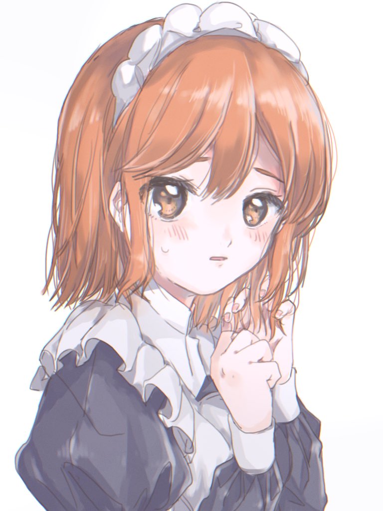 1girl alternate_hair_length alternate_hairstyle apron asahina_mikuru blush commentary_request enso_doraiba long_sleeves looking_at_viewer maid medium_hair official_alternate_costume orange_eyes orange_hair parted_lips portrait puffy_long_sleeves puffy_sleeves simple_background solo suzumiya_haruhi_no_yuuutsu sweatdrop white_apron white_background