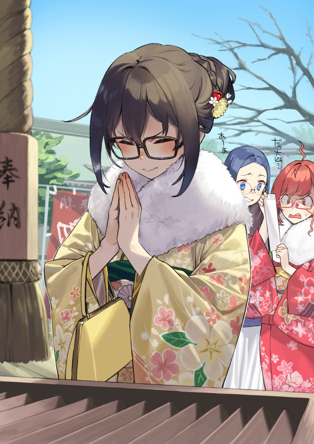3girls 92m alternate_hairstyle black-framed_eyewear black_hair blue_sky closed_eyes dateko_(92m) floral_print fur-trimmed_kimono fur_trim glasses hatsumoude highres japanese_clothes kakita_(92m) kimono kinshi_no_ane_(92m) long_sleeves multiple_girls new_year original outdoors praying print_kimono red_hair red_kimono short_hair sky yellow_kimono
