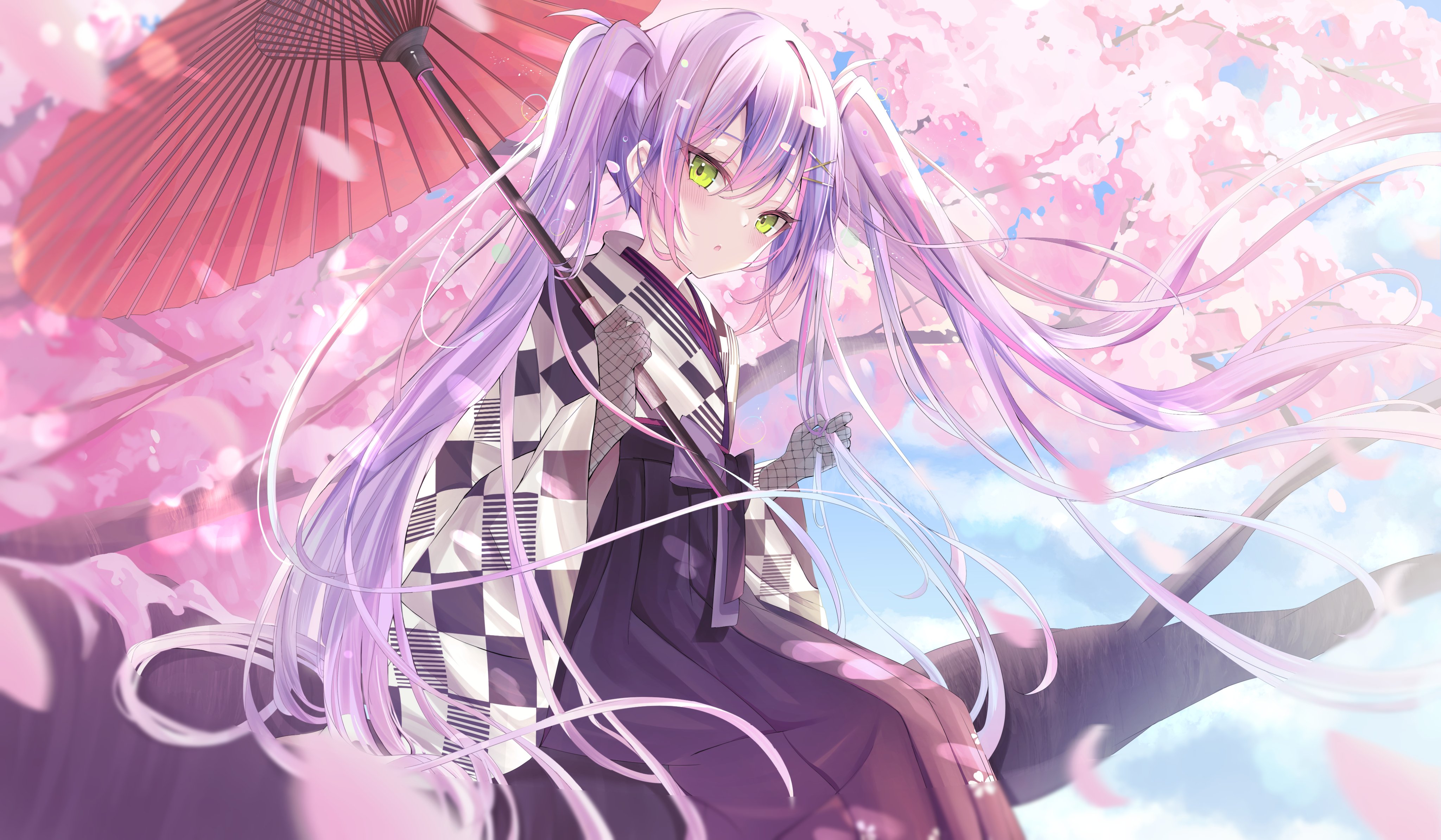 1girl absurdres blush bow cherry_blossoms cherry_tree eyes_visible_through_hair fishnet_gloves fishnets gloves hair_between_eyes hair_ornament hairpin highres hololive japanese_clothes kimono long_hair long_sleeves outdoors petals purple_hair ririge tokoyami_towa tokoyami_towa_(new_year) twintails umbrella virtual_youtuber yellow_eyes