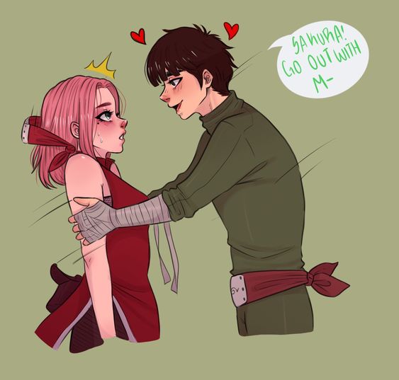 1boy 1girl bandaged_arm bandages black_hair english_text eye_contact green_background hairband hand_on_another's_shoulder hand_on_shoulder hands_on_another's_shoulders hands_on_shoulders haruno_sakura heart jumpsuit lips looking_at_another naruto_(series) naruto_shippuuden naruto_shippuuden pink_hair red_hairband rock_lee short_hair source_request