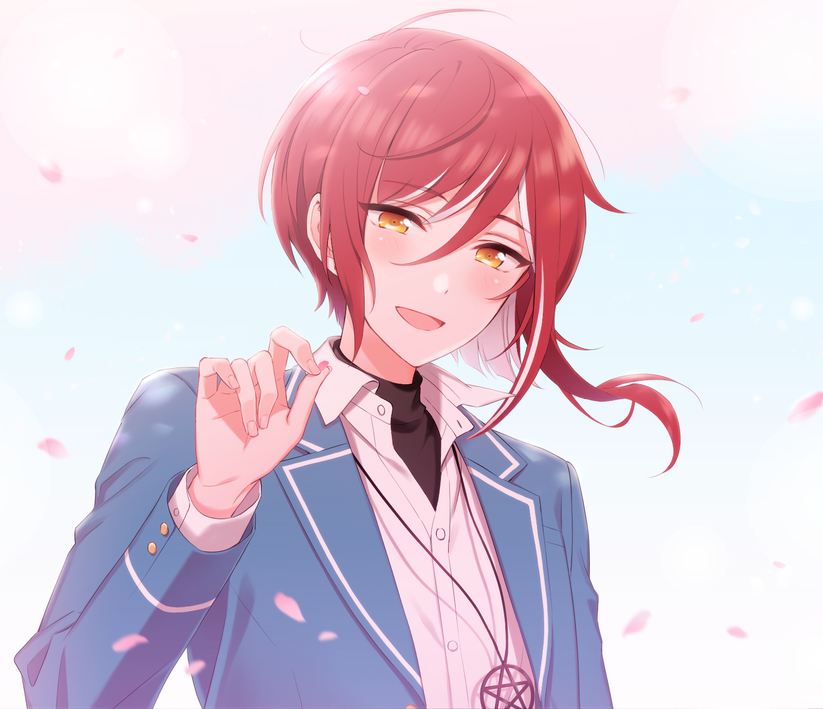 1boy asymmetrical_bangs blue_jacket collared_shirt ensemble_stars! hair_between_eyes highres jacket jewelry li_(rkce2433) long_sleeves multicolored_hair necklace open_mouth red_hair sakasaki_natsume school_uniform shirt short_hair simple_background solo streaked_hair switch_(ensemble_stars!) upper_body white_hair yellow_eyes yumenosaki_school_uniform