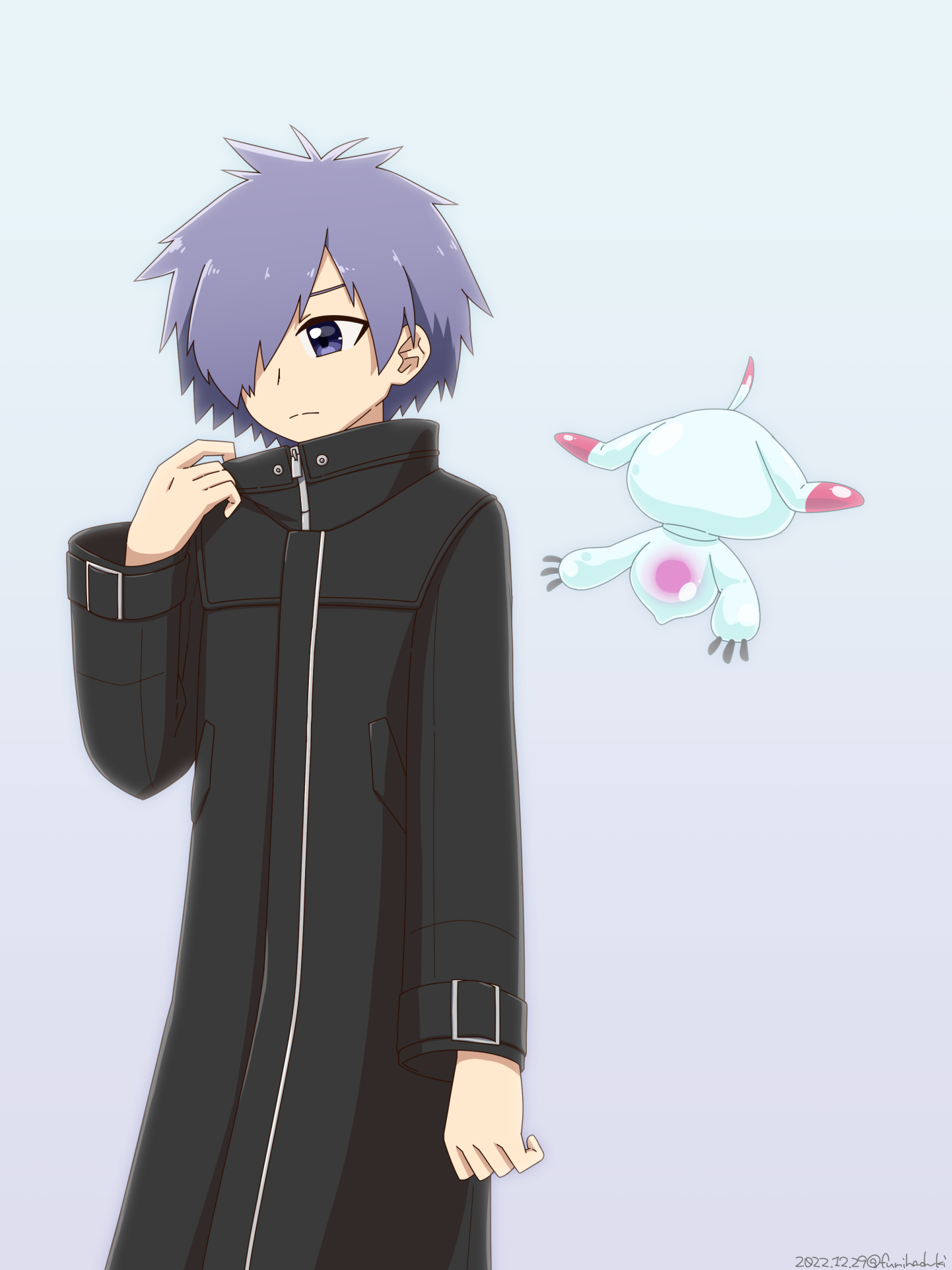 back-to-back belt digimon digimon_adventure_02:_the_beginning floating highres owada_rui purple_eyes purple_hair short_hair ukkomon zipper