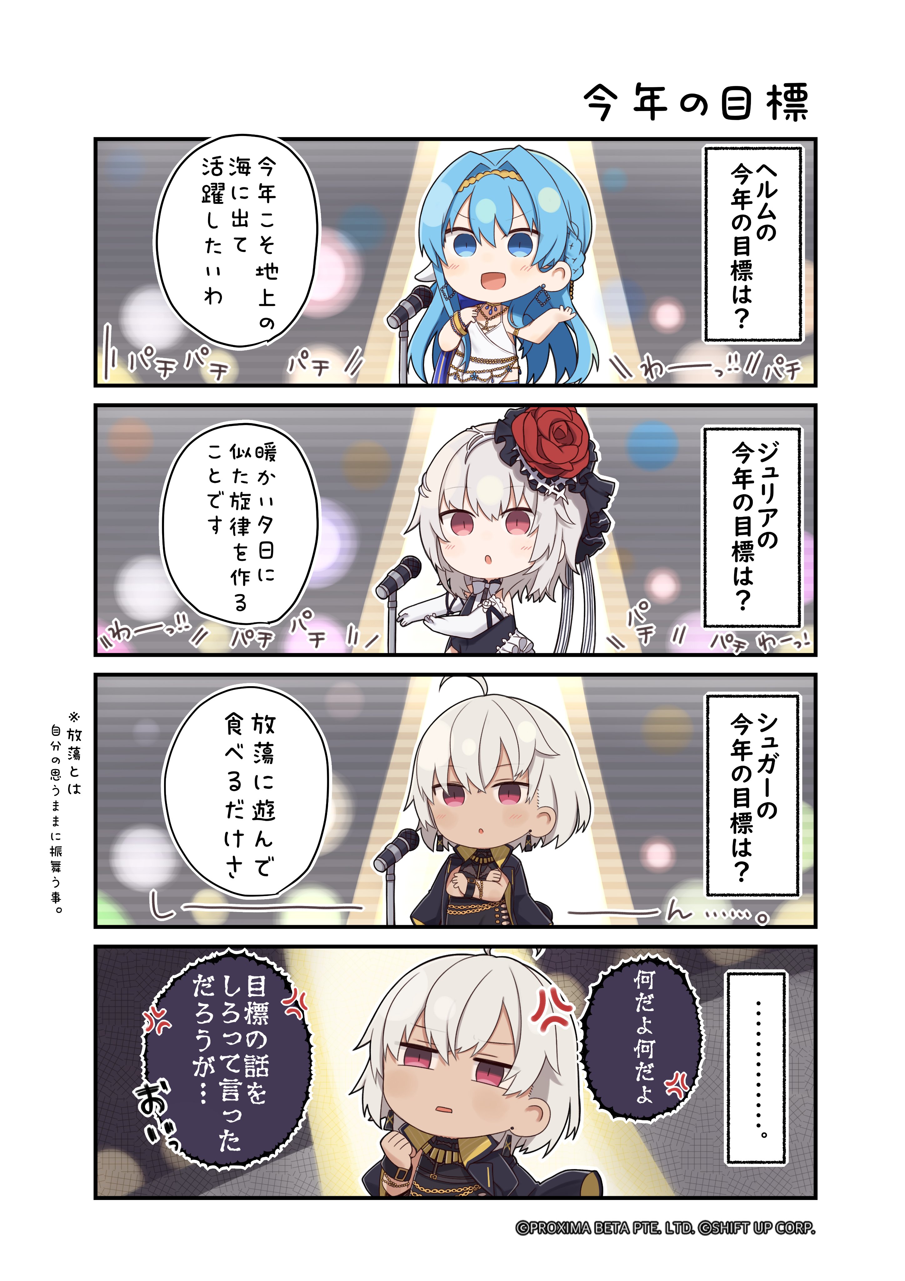 3girls 4koma absurdres ahoge anger_vein black_dress blonde_hair blue_hair braid chibi coat coat_on_shoulders comic commentary commentary_request dark-skinned_female dark_skin dress elbow_gloves flower french_braid gloves goddess_of_victory:_nikke hair_flower hair_intakes hair_ornament helm_(chandelier)_(nikke) helm_(nikke) highres julia_(mild_nocturne)_(nikke) julia_(nikke) long_hair microphone microphone_stand multiple_girls official_art red_eyes short_hair spotlight sugar_(hard_boiled)_(nikke) sugar_(nikke) totatokeke translation_request white_hair