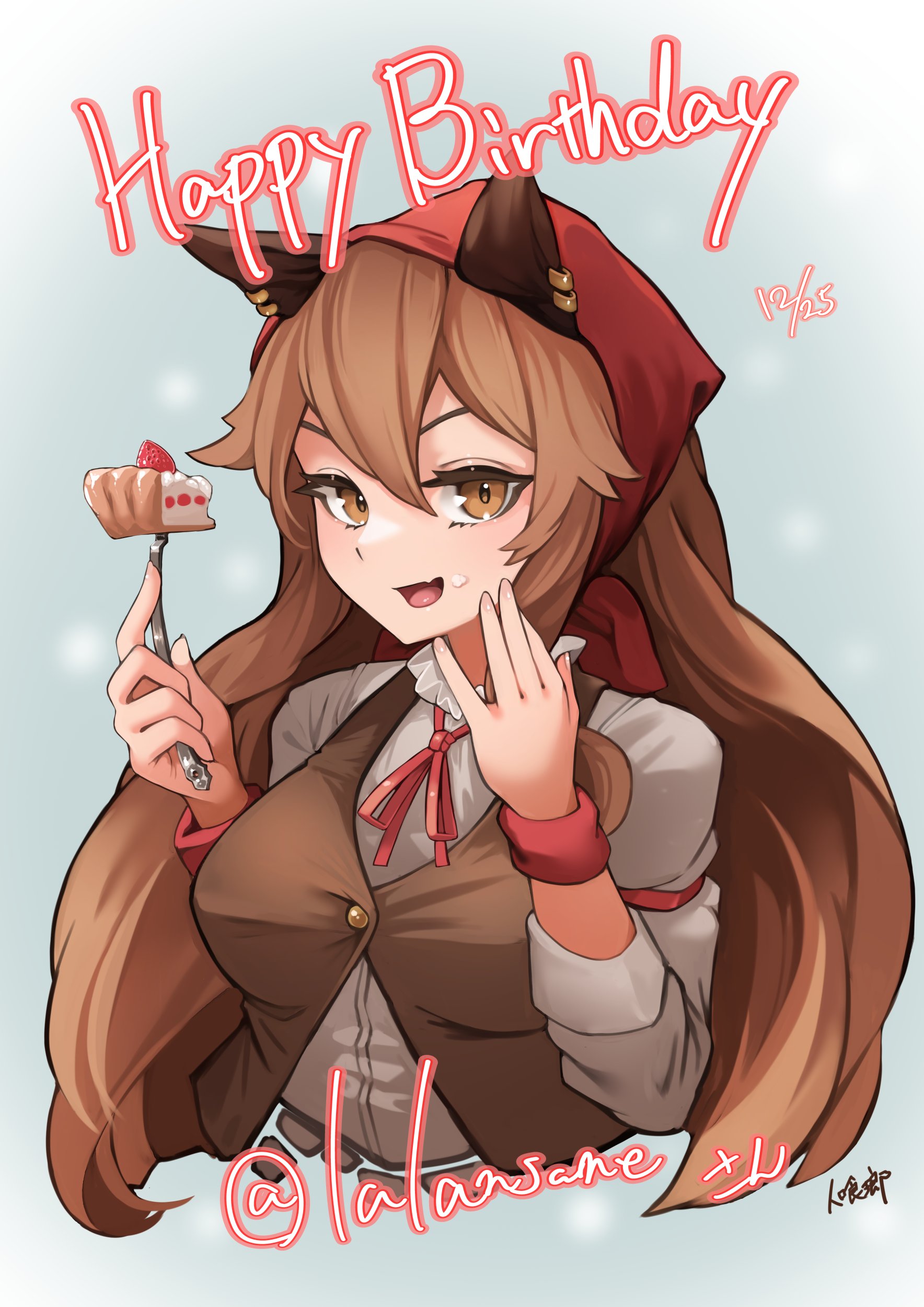 1girl absurdres animal_ears armband borrowed_character brown_eyes brown_hair brown_vest cake cake_slice dated earrings food food_on_face fork grey_background grey_shirt headscarf highres hitokuirou holding holding_fork jewelry long_hair long_sleeves looking_at_viewer neck_ribbon original red_headscarf red_ribbon ribbon shirt simple_background smile solo strawberry_shortcake tsana_(lansane) vest wolf_ears
