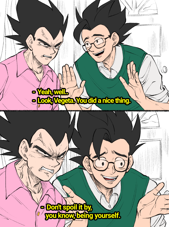 2boys anger_vein angry black_eyes black_hair bloodshot_eyes clenched_teeth comic door dragon_ball dragon_ball_super english_text glasses green_sweater_vest jorongbak male_focus multiple_boys open_mouth parody partially_colored pink_shirt shirt smile son_gohan spiked_hair subtitled sweater_vest teeth that_70s_show vegeta