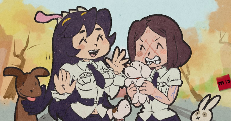 2girls ^_^ blush_stickers brown_hair carol_(skullgirls) clenched_teeth closed_eyes dog filia_(skullgirls) holding minawa108 multiple_girls necktie open_mouth outdoors painwheel_(skullgirls) pleated_skirt rabbit samson_(skullgirls) scar school_uniform skirt skullgirls teeth tongue tongue_out tree veins