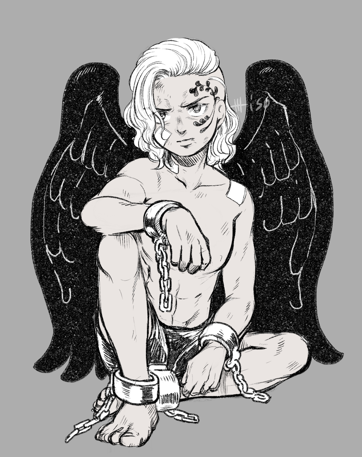 1boy abs aged_down asymmetrical_hair bandaid barefoot black_shorts black_wings child cuffs facial_tattoo full_body grey_background hair_over_one_eye handcuffs highres king_(one_piece) knee_up male_focus medium_hair misokkasu monochrome one_piece shorts signature sitting tattoo topless_male white_hair wings