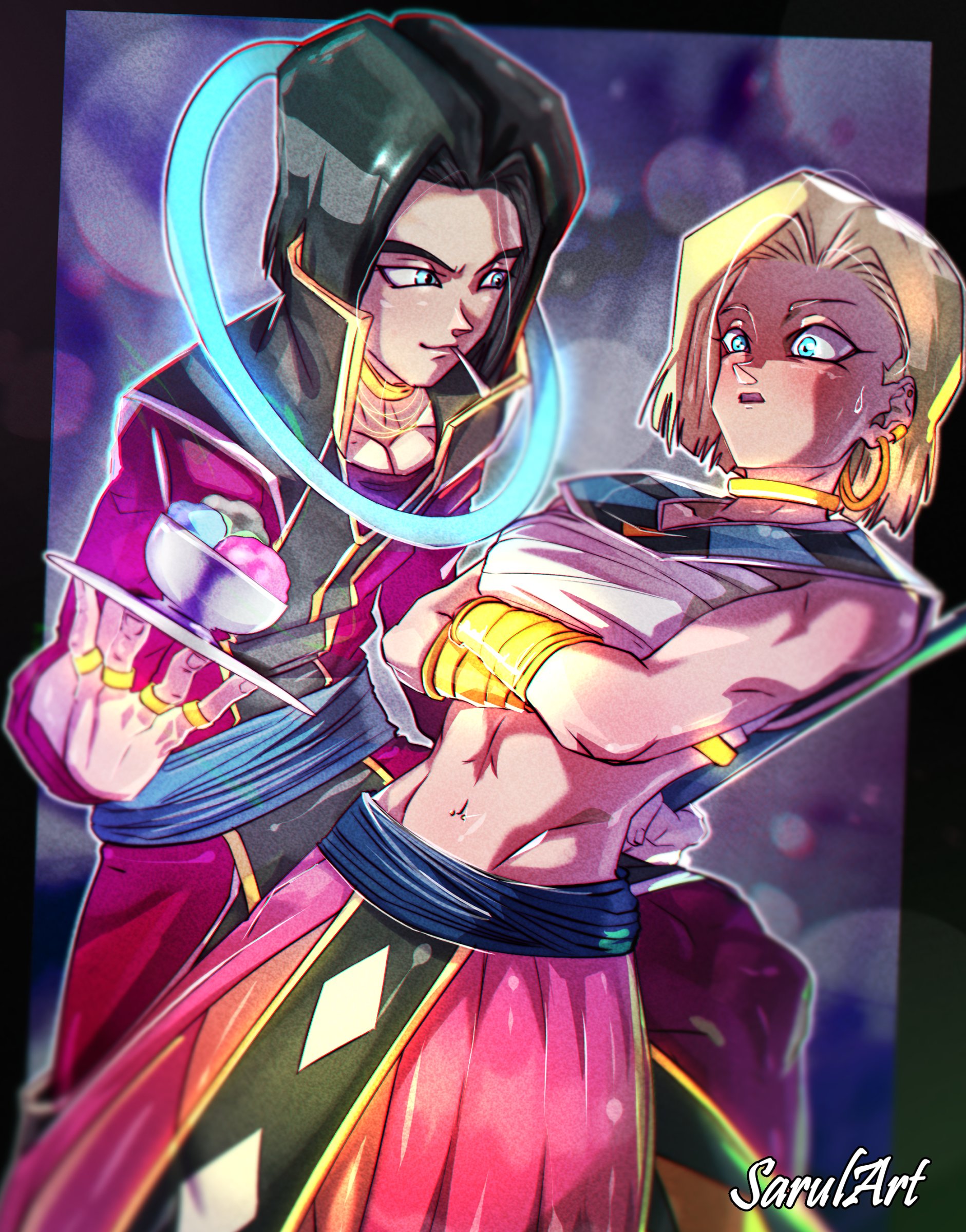 1boy 1girl :o abs alternate_costume android_17 android_18 black_hair blonde_hair blush bracelet brother_and_sister crossed_arms dragon_ball dragon_ball_super food halo highres ice_cream jewelry navel ring sarulart short_hair siblings smile surprised tray whis