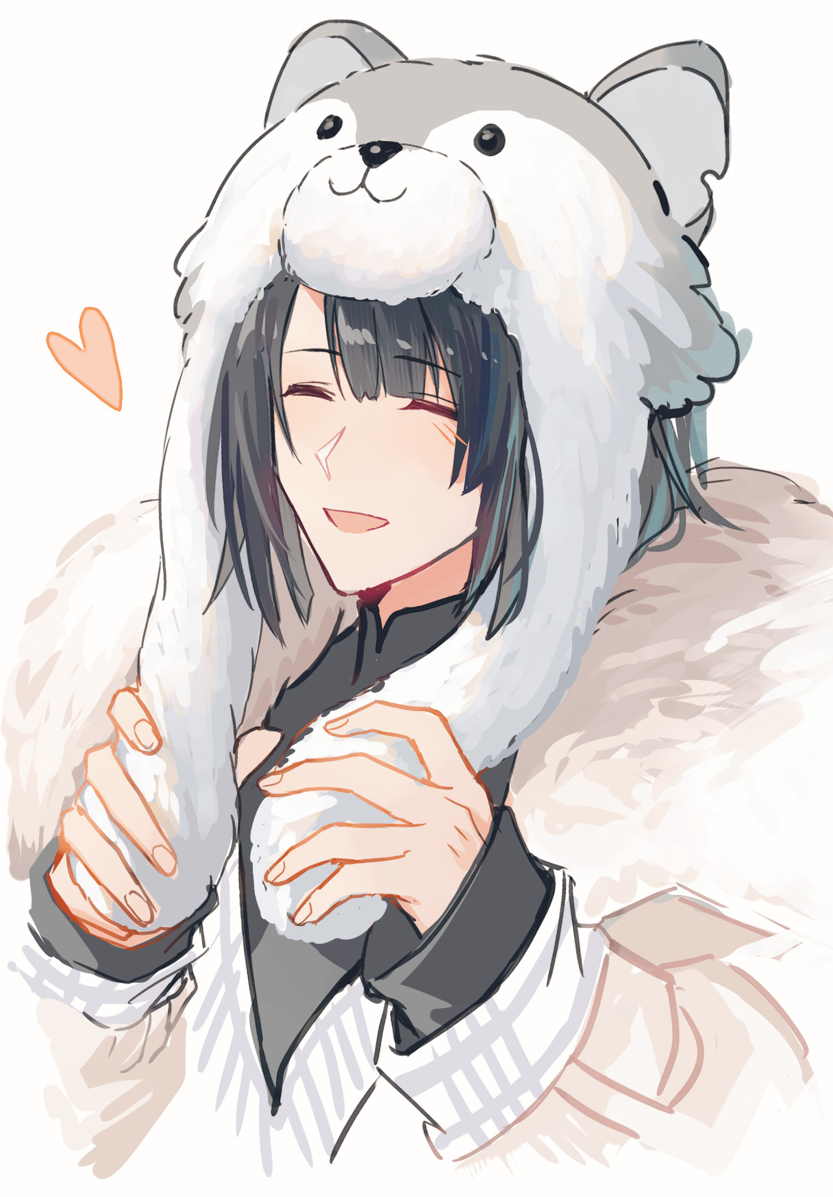 1boy :d alternate_costume animal_hat animal_hood bishounen black_hair blush chinese_commentary fate/grand_order fate_(series) happy hat heart highres hood lalatia-meai long_hair male_focus open_mouth shirt smile solo taigong_wang_(dream_portrait)_(fate) taigong_wang_(fate) unfinished upper_body